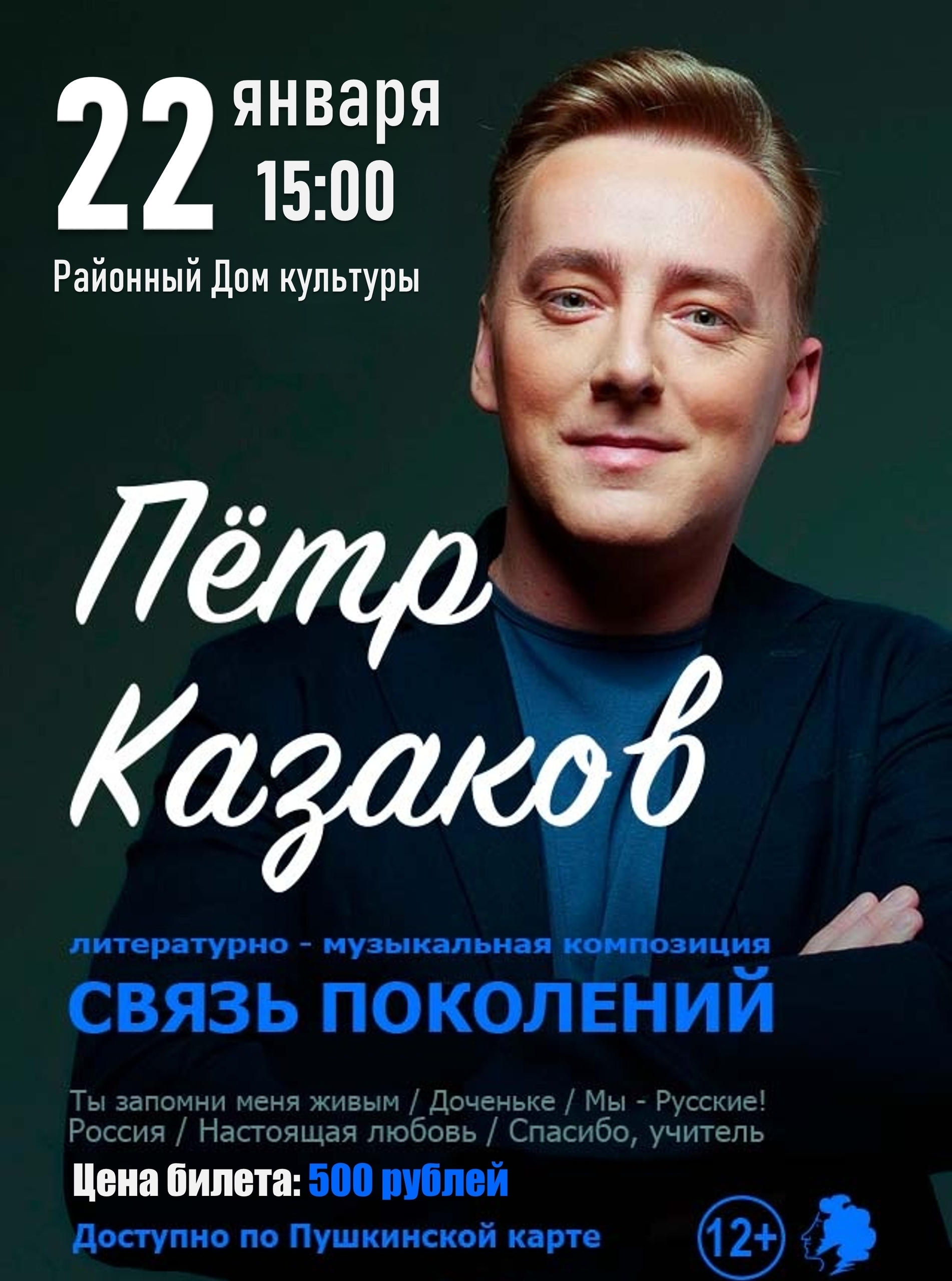 22 января 2026 года в рамках реализации государственной программы культурного просвещения "Пушкинская карта" в районном Доме культуры наши обучающиеся 8-9 классов побывали на концерте Петра Казакова, поэта и исполнителя, представившего свою музыкальную программу «Связь поколений».