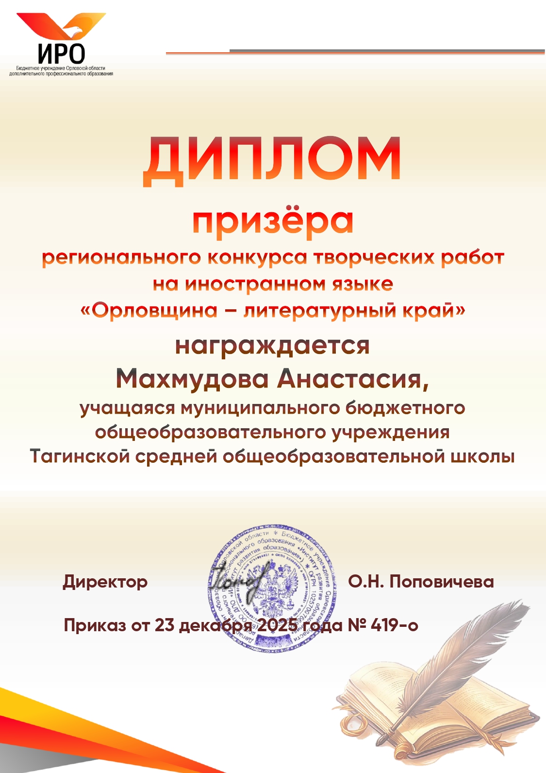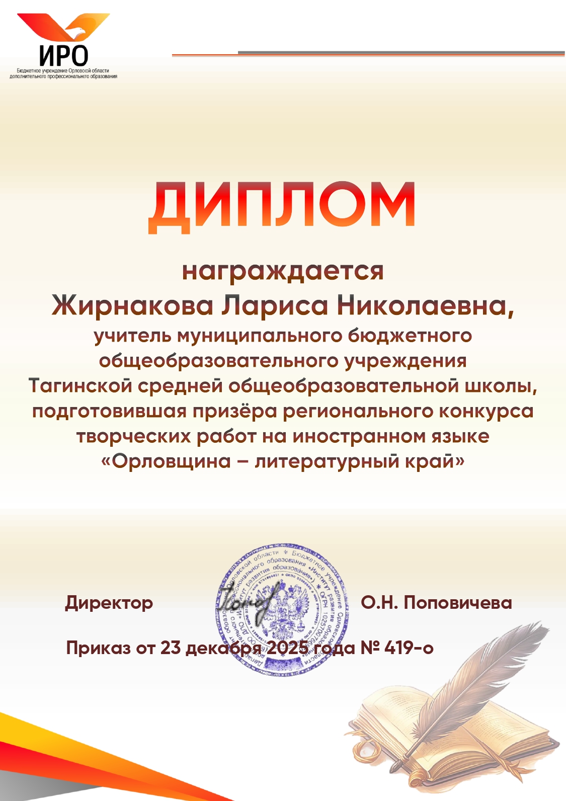 25 декабря 2025 года были подведены итоги регионального конкурса творческих работ на иностранном языке «Орловщина – литературный край» для обучающихся общеобразовательных организаций, образовательных организаций среднего профессионального и высшего образования, который был организован отделом иностранных языков БУ ОО ДПО «Институт развития образования» и проходил в период с 1 сентября по 15 декабря 2025 года.