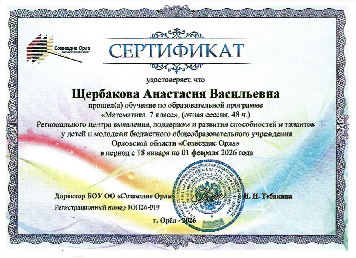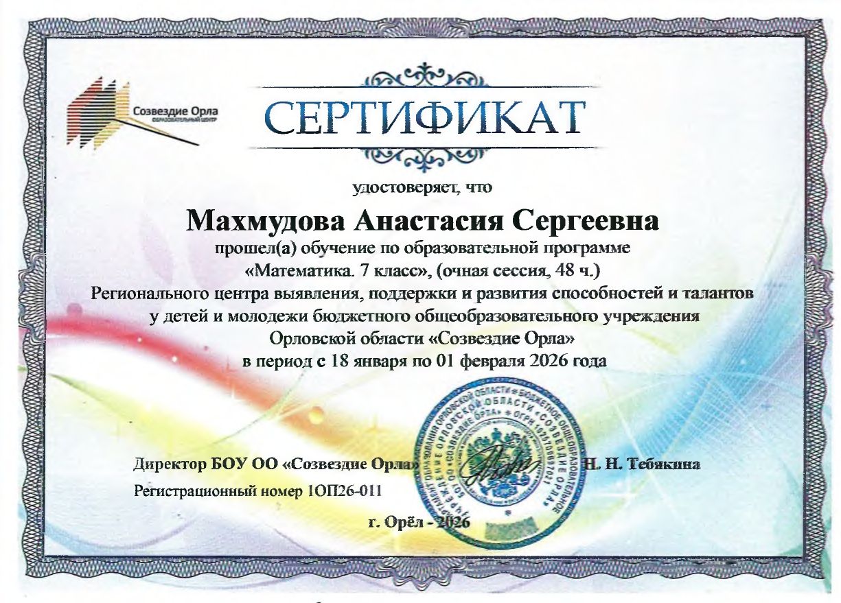 🚀 «Созвездие Орла» зовёт в полёт! С 18 января по 01 февраля Махмудова А. и Щербакова А. (7 класс) проходили обучение по образовательной программе "Математика. 7 класс" (очная сессия, 48 часов). Ученицы приобрели новые навыки, нашли настоящих друзей и получили незабываемые эмоции.