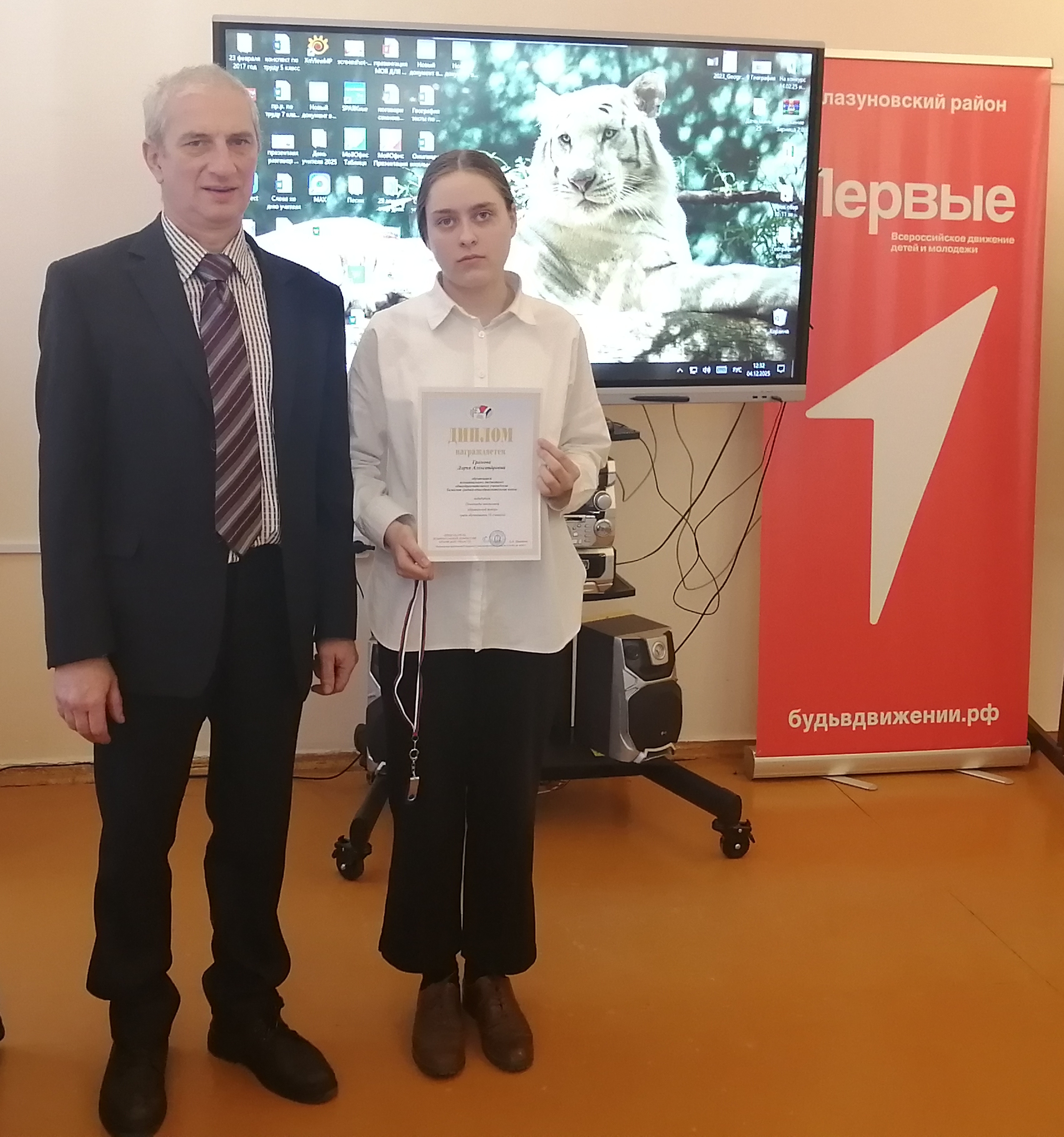 Сегодня в нашей школе прошло награждение победителя муниципального этапа олимпиады "Софиум". Грамоту и медаль Громой Дарье, ученице 10 класса, вручил Горло Александр Васильевич, председатель ТИК Глазуновского района.